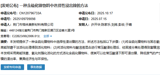 2025年10月17日,荆门市格林美新材料有限公司成功申请一项名为“一种含硫化镍物料中选择性浸出镍的方法”专利,申请公布号为CN120796733A,申请日期为2025年7月15日。